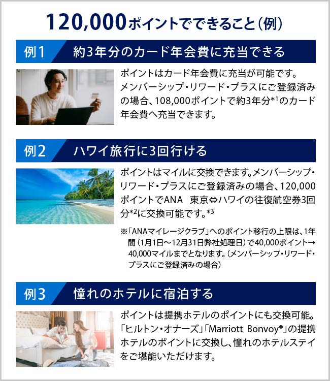メンバーシップ・リワード・プラス(年会費通常3,300円)が無料で付帯しているため、下記特典も追加されます!