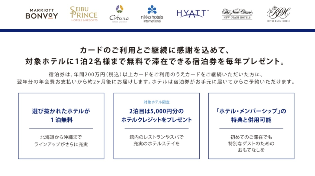 年間200万円以上利用してカードの更新をすると国内の対象ホテルに1泊2名で泊まれる無料宿泊券がもらえちゃう🎁