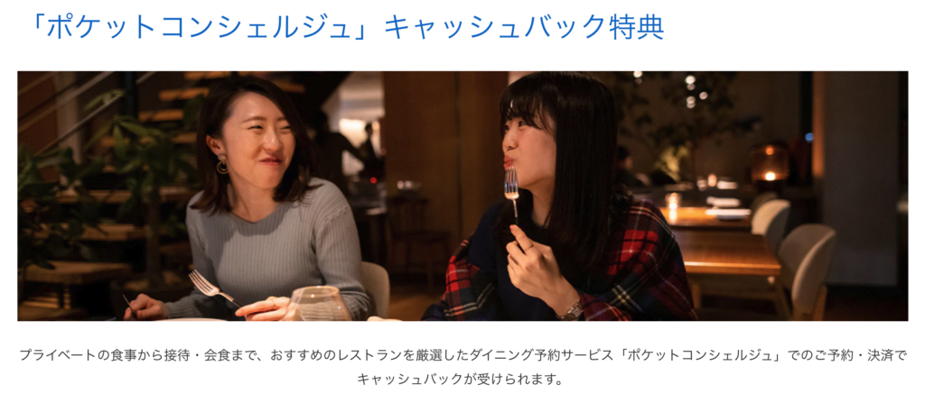 「ポケットコンシェルジュ」という厳選されたレストラン予約サイトを経由して予約・決済するだけで、利用額の20%がキャッシュバックされます(上半期・下半期で各5,000円が上限)。
