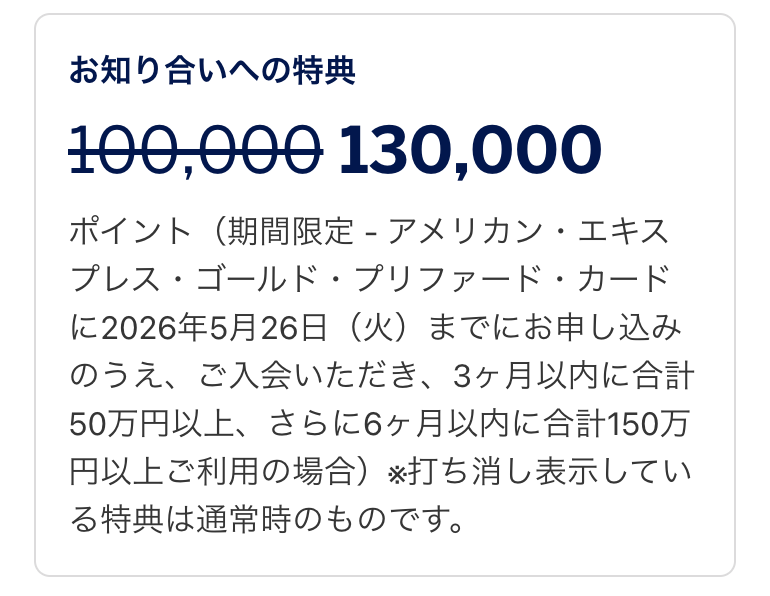 友達招待を使ってゴールド・プリファードに新規申し込みおよび利用条件の達成すると入会特典として最大130,000ポイントがもらえます!