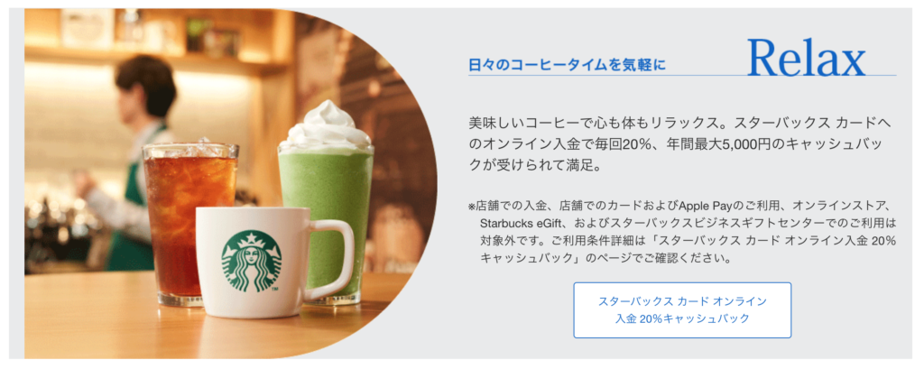- 対象取引:スターバックス カードへのオンライン入金(公式アプリまたは公式サイト経由)